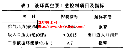 為確保液環真空泵及其后續系統運行平穩,對真空泵出口排氣壓力、吸人口壓力及工作液循環流量等均需進行合理控制。液環真空泵主要的工藝控制項目及指標見表1。