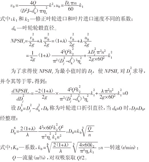 設(shè)葉片進(jìn)口圓周分速度VUI=0,由葉片進(jìn)口稍前的速度三角形w02=v02+u02 ,有增大葉輪進(jìn)口直徑DJ,則圓周速度u0增大、V0減小,必存在一個(gè)DJ使二者平方和最小。現(xiàn)利用求導(dǎo)數(shù)方法求Dj: