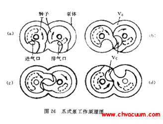 隨著轉(zhuǎn)子按箭頭方向進(jìn)一步旋轉(zhuǎn),由于兩個(gè)爪起閥的作用,使 Vc 中的部分氣體又返回到吸氣腔 Vs 中,于是 Vs 腔內(nèi)的氣體壓力由 Pi 升高至中間壓力 P ,并進(jìn)一步被轉(zhuǎn)子壓縮至排氣壓力 P0 ,其示功圖如圖 28(c) 所示。顯然,從節(jié)省功耗的觀點(diǎn)出發(fā)爪式泵優(yōu)于羅茨泵。