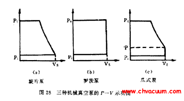 爪式真空泵與羅茨真空泵相比,所需的壓縮功率小。由圖 28 所示的 P-V 示功圖可知,旋片泵的氣體壓縮過程是內(nèi)壓縮過程,每一循環(huán)分為等壓吸氣、多變壓縮和等壓排氣三個(gè)階段,其示功圖如圖 28(a) 所示。