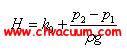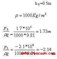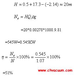 例2-2用清水測定一臺離心泵的主要性能參數。實驗中測得流量為10m3/h,泵出口處壓力表的讀數為0.17MPa(表壓),入口處真空表的讀數為-0.021Mpa,軸功率為1.07KW,電動機的轉速為2900r/min,真空表測壓點與壓力表測壓點的垂直距離為0.2m。試計算此在實驗點下的揚程和效率。