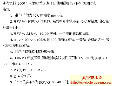 ① 瑞士BA 501 泵, 用P3 油。上海真空泵廠的同類產品X-150 單級旋片真空泵用SH0528—92、HFV-68 礦物油型真空泵油, 已9 年。