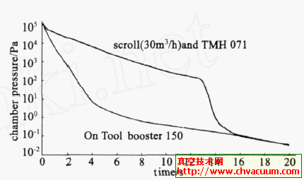 由于側槽的設計和葉輪的旋轉,氣體分子形成了一個沿葉輪旋轉方向的渦流。側槽泵的工作狀態是可變的。一個高速運轉的葉輪通過動量傳輸作用將能量施加給氣體分子。由于這種渦流式的運動,氣體分子在到達排氣口前會不斷地碰撞葉輪。與葉輪的多次碰撞使能量傳輸到氣體中,從而使氣體得以壓縮。側槽級的壓縮比比一般的動量傳輸式泵要高。為了使側槽級工作在最佳的狀態,被抽氣體應為粘滯流態,也就是說槽的尺寸應比氣體分子的平均自由程大。側槽泵也可工作在大氣壓下。OnTool干泵采用臥式結構,在同一根軸串聯了Holweck級轉子、側槽旋渦級轉子和內電機轉子,轉速可達60,000r/min 。抽速可達130m 3/h 。冷卻采用水冷,對于抽速為84m 3/h 的OnTool干泵,冷卻水入口溫度18 ℃,水流量達150L/h 。OnTool干泵的運轉時噪聲低于60dB 。圖12列出了配用OnTool干泵時的真空室壓力隨抽氣時間的變化曲線(下) ,并與配用分子泵+渦旋泵機組時的抽氣時間曲線(上) 進行了比較,可以明顯看出,配用OnTool干泵的優勢。