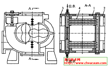 針對零件的受熱膨脹, 我們認為可以采用以硅樹脂為基料的絕熱涂料, 對轉子表面、泵體內腔、兩側蓋與泵體連接表面進行噴涂處理, 以隔絕壓縮氣體產生的熱量傳遞給轉子、泵體及兩側蓋。而涂料本身的線膨脹系數很小, 因此可以大大減輕零件的受熱膨脹對各項間隙的影響。這些涂料還具有防腐蝕, 防氧化的功能, 在石油化工廠, 冶金煉鋼廠, 發電廠等高溫部位及設備上已得到了廣泛的應用。而泵體內的熱量由裝在泵腔內的氣體冷卻器吸收, 其結構見圖1 所示。這樣又可以降低排氣溫度,進一步降低羅茨泵的間隙流導。