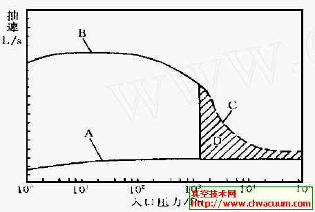 A1前級泵抽速曲線 B1羅茨泵抽速曲級(1300Pa啟動) C+B1帶溢流閥羅茨泵抽速曲線 D1由于溢流閥而增加的抽速