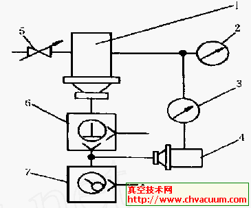 11 羅茨泵試驗罩 2、3真空計 41前級試驗罩 51微調閥 61羅茨泵 71前級泵(滑閥泵或旋片泵)