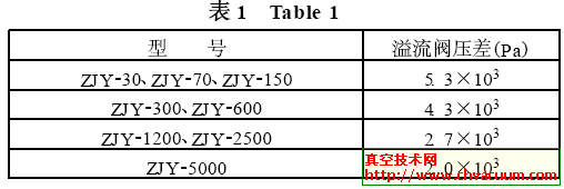 還有一個問題必須注意,萬一阻尼塊失去阻尼作用,則在溢流閥開啟后會產生連續不斷的跳動, 發出清脆的撞擊噪聲,并導致壓力和抽速的波動,使羅泵不能正常工作。由于帶溢流閥的羅茨泵能顯著縮短真空系統低真空范圍的抽氣時間,給用戶帶來明顯的經濟效益,而且運轉安全可靠, 因此目前帶溢流閥羅茨泵在整個羅茨泵的需求中已占有極其重要的地位。現行羅茨泵標準還沒有將溢流閥的有關指標和試驗方法列入其中,因此應盡快規定不帶溢流閥的羅茨泵考核最大允許壓差,帶溢流閥的羅茨泵考核溢流閥壓差。溢流閥壓差參照國外有關資料和國內實際情況, 建議按表1 選取。