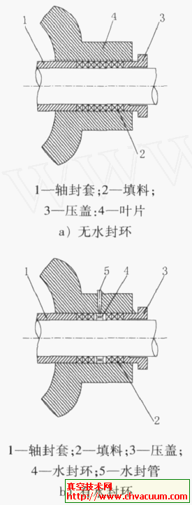 單級雙吸中開式離心泵主要用于拉絲設備的冷卻供水和冷卻塔的補水。泵軸穿出泵殼時,在軸與殼之間存在著間隙,此間隙如密封不好,泵殼內的高壓水就會向外大量泄漏。填料盒是常用的1種軸封手段,它的形式很多,主要由軸封套、填料、水封管、水封環及壓蓋等組成。填料盒在軸封裝置中起著阻水或阻氣的密封作用,常用的填料是浸油、浸石墨的石棉繩。隨著技術的進步,出現了各種耐高溫、耐磨損以及耐強腐蝕的填料,如用碳素纖維、不銹鋼纖維及合成樹脂纖維編織成的填料。為了提高密封效果,填料繩一般做成矩形斷面。填料用壓蓋壓緊,壓緊程度可通過壓蓋上的螺栓進行調節,壓得太松,達不到密封效果;壓得太緊,泵軸與填料的機械磨損大,消耗功率也大,甚至產生抱軸現象。一般以水封管內水能夠通過填料縫隙呈滴狀滲出為宜。泵殼內的壓力水由水封管經過水封環中的小孔流入軸與填料間隙,起到引水冷卻與潤滑的作用。原來的填料盒沒有水封環,改進前后的結構如圖1所示。