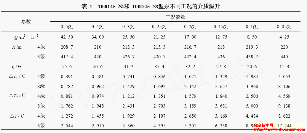 (2) 流量越小,揚程越高,效率越低,泵內溫升越大,最小無汽蝕流量也越大;平衡裝置回水引起的溫升比泵內阻引起的溫升高。