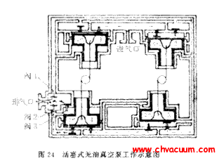 活塞式無油真空泵的外形呈扁方形,是由四個階梯形活塞及四個階梯形氣缸組成。與電機直聯的軸通過四根連桿帶動四個活塞。活塞的背面空間由次級活塞抽氣,以減少泄漏和降低極限壓力。每個氣缸都有進氣閥與排氣閥。