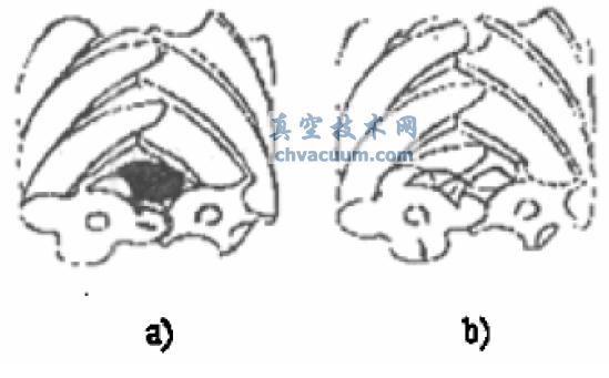 圖1示出了螺桿真空泵的吸氣過程。在圖1中,陽轉子按逆時針方向旋轉,陰螺桿按順時針方向旋轉。圖中上方的轉子端面是吸氣斷面,下方的端面為排氣端面。