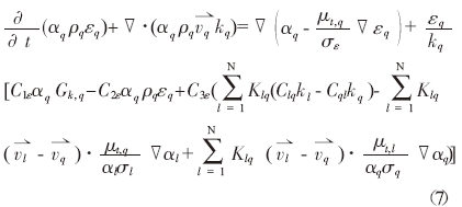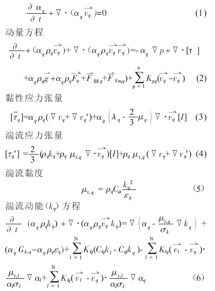 基本方程組使用多相流動歐拉方法的標準k-e湍流模型,即分別在流體各相中引入k-e湍流模型。考慮相數為n 的多相流動的一般情形,各流相q的方程組為: