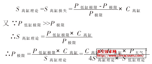 高缸在極限壓力附近的返流為分子流狀態,則此時高缸的間隙流導與壓力無關,只與高缸間隙大小相關,所以可設此時高缸的間隙流導為C 高缸。高缸沒有排氣閥,高缸的排氣壓力始終與低缸的進氣壓力相同,所以可得: