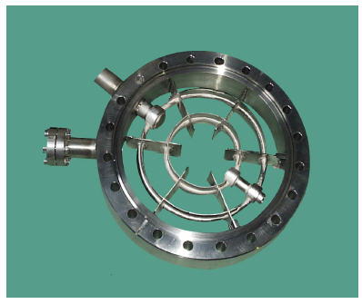 這樣的設(shè)計能充分發(fā)揮分子泵和深冷水氣阱各自的優(yōu)越性能,不但能獲得無油無水的清潔真空,而且能達到抽氣時間大大縮短,極限真空度提高的要求。在連續(xù)生產(chǎn)過程中,快速達到進料室要求的真空度,去除由大氣導(dǎo)入進料室的水氣,避免工作氣體(其中有CF4,BCl3,HBr 等有毒、腐蝕性氣體)與大氣導(dǎo)入水氣的化學(xué)反應(yīng),對提高生產(chǎn)效率和產(chǎn)品質(zhì)量都是極為有利的。深冷水氣阱由三井公司設(shè)計,用真空釬焊工藝制成,具有氣阻小、深冷效果好的特色,深冷水氣阱的照片見圖1。