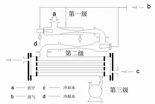 2.本泵之第二級水蒸汽噴射泵繼續壓縮上述工作介質到70mmhg然后排之氣體引往列管冷凝器冷凝。冷凝后的液體進入下部第三級水環泵抽吸,壓縮后往大氣中。