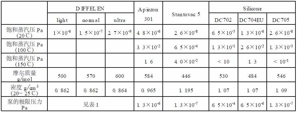 國外公司泵的極限壓力與采用的工作液相對應, 有的公司未給出具體的指標, 只給出泵的抽氣范圍作為參考, 如Pfeiffer 公司。工作液的品質對泵的極限壓力影響非常大, 從Leybold 公司的資料顯示同一型號的泵采用不同的泵油其指標相差可達2 個數量級, 見表1。各公司均給出不同的工作液供用戶選擇, 滿足不同用戶的需要。ULVAC 公司有UL-VAC-D11、ULVAC-D31 等, Leybold 公司有DIF-FELEN 、Silicone 等, BOC Edw ards 公司有San tovac 5、Silicone、Apiezon 系列等。
