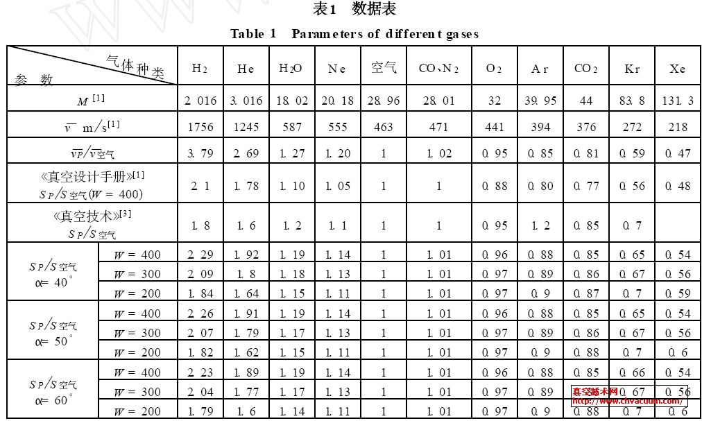 常規參數的具體值: 溫度為293K, A為40°、50°和60°, 標準狀態下常用氣體分子平均熱運動速度見表1。根據已知參數W計算出為200、300 和400m/s油擴散泵對不同氣體與空氣抽氣速率的比值SP/S 空氣, 其中400m/s 時的計算比值用于和蘭州物理所數據的比較。表1中摘錄了王欲知先生撰寫的《真空技術》中“各種氣體的抽速比較”和蘭州物理研究所編寫的《真空設計手冊》(第三版)中“蒸汽流泵對不同種類氣體的理論抽速”的數據。需要指出的是,《真空技術》中沒有給出計算公式, 引用的是1975年《MNP》中的數據(詳見書中“參考資料”) ;《真空設計手冊》中引用的抽速表達式與公式(1) 基本相同,只是沒有cosA。