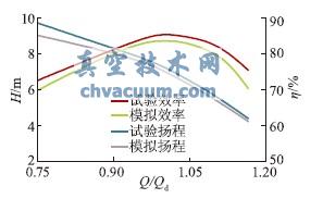 計算以時均N-S方程為基本控制方程,采用標準k-ε雙方程湍流模型,進口邊界條件設為velocityinlet,出口邊界條件設為opening.首先進行定常計算,得到不同工況下模型泵的外特性曲線,并與試驗結果進行對比,如圖2所示.可以看出,數值計算得到的外特性曲線與試驗曲線總體變化趨勢一致,這表明所采用的計算模型及方法是可靠的.