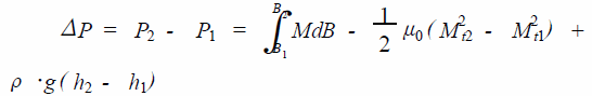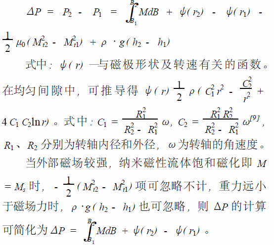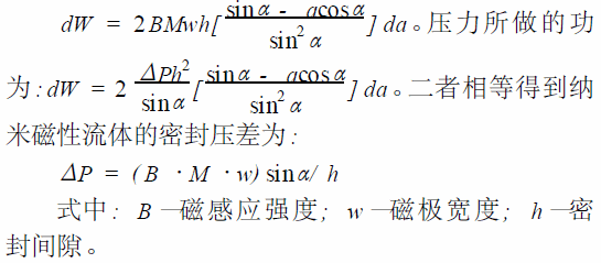 哈爾濱工業(yè)大學的鄒繼斌等根據(jù)磁性流體的連續(xù)介質模型, 推導出納米磁性流體的內部壓強, 并且通過應力分析得出納米磁性流體表面的邊界壓差,進而推導出密封壓差公式為: