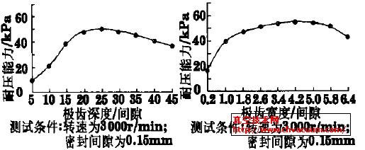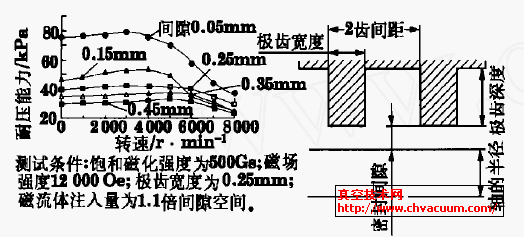 磁流體密封的結構參數主要指密封間隙(有時也叫工作氣隙)、極齒形狀和尺寸。密封間隙對密封耐壓能力的影響見圖2。極齒形狀與尺寸的含義見圖3。各參數對密封能力的影響見圖4、圖5。