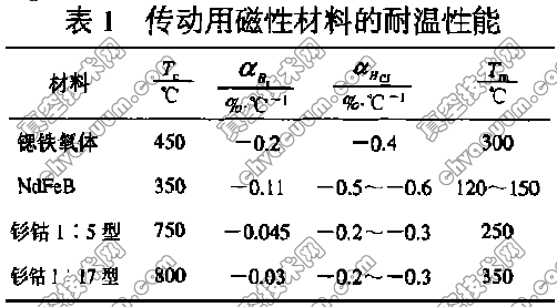 永磁傳動器大都在密封介質中工作,用量較大的是石化工業,往往有溫度要求。目前國內廠家所生產的磁性材料的居里溫度Tc、剩磁溫度系數αBr、矯頑力溫度系數αHCJ及最高工作溫度Tm列于表1。