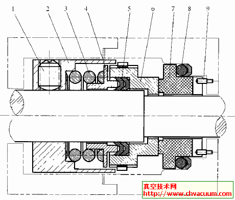 機械密封是靠2個經(jīng)過精密加工的動環(huán)和靜環(huán)的端面靠彈簧沿軸向緊接觸來達到密封的。(靜環(huán)固定,動環(huán)與軸一起旋轉(zhuǎn))所以又稱端面密封。機械密封的結(jié)構(gòu)如圖1所示,為單端面非平衡型大彈簧機械密封的典型結(jié)構(gòu)。