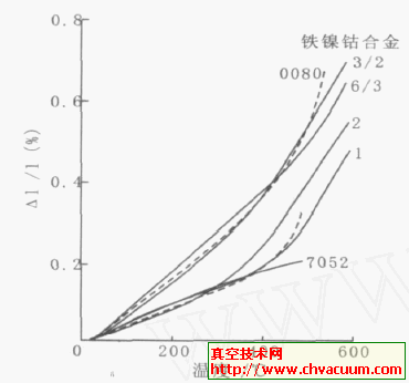 玻璃-金屬匹配封接常用的封接材料主要有: 鐵合金(鎳鋼) , 通過改變鎳的含量從35%到65% , 膨脹系數(shù)連續(xù)地變化, 這樣便能獲得恰好與真空玻璃相匹配的合金。這些合金的膨脹系數(shù)在磁轉(zhuǎn)變點(diǎn)(居里點(diǎn)) 增大, 這更有利于匹配退火溫度下的玻璃為。典型合金的膨脹特性曲線如圖2 所示。鎳鋼內(nèi)鎳含量少, 膨脹系數(shù)變小, 居里點(diǎn)也降低。若要居里點(diǎn)高于400℃, 鎳含量就必須大于44%, 這樣膨脹系數(shù)便大于70×10-7℃21, 這只能和軟玻璃封接。例如,50%N i250%Fe 合金, 膨脹系數(shù)約90×10-7℃21 , 居里點(diǎn)約500℃, 能和DB-401 玻璃或0120 玻璃匹配封接。為了改善接頭的真空密封性, 常常添加少量鉻(0.8%~6%)。封接時(shí)生成的氧化鉻溶入玻璃內(nèi)并牢固地粘附于合金表面。