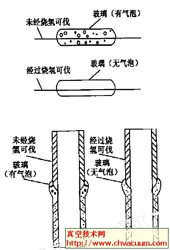選一段玻璃管內徑略大于金屬管處外半徑,套在金屬管上,長約3 毫米(金屬口徑大,套在上面的玻璃長些,反之就要短些,應根據具體情況定,接觸面過少強度弱) . 火焰著重燒在金屬部位玻璃部位火焰少些,因為玻璃是絕緣性材料,不易導熱,受熱部分容易燒熔. 而金屬導熱性能好,容易散熱. 若金屬表面溫度不高,玻璃就不容易粘合上去. 當金屬和玻璃升到一定溫度時,兩者就會自行熔粘. 因為金屬表面有一層氧化層,起到媒介作用,所以能與玻璃堅固地粘結在一起. 再加大火焰提高溫度,使玻璃熔融光滑,邊燒邊輕微吹氣,不使玻璃變形,封接完畢再進行退火.