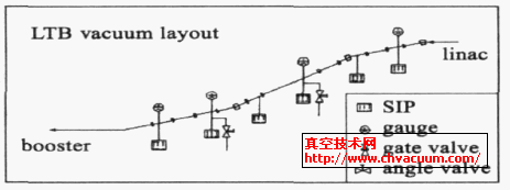 輸運線真空室殘余氣體主要是H2 、CO、H2O、N2和CO2 ,對于惰性氣體含量沒有特別的要求,因此在高、低能輸運線上主泵系統全部采用二極濺射離子泵(SIP) ,其完全無油、無震動、大抽速和高極限真空度的特點非常適合同步輻射光源的真空環境。由于傳輸束流在輸運線上沒有阻抗要求,因此離子泵全部采用大直徑圓筒的泵站結構安裝,減少有效抽速的損失。在避開特殊部件如磁鐵和某些對位置要求嚴格的束測元件(如光束狹縫) 的基礎上,離子泵的位置按照一定間距排布,盡量使得輸運線的壓強分布均勻。輸運線要求整段壓強小于2 ×10 - 5 Pa ,儲存環的靜態壓強要求小于2.6 ×10 -8 Pa ,因此在靠近儲存環注入區域,高能輸運線的真空系統設計要適當增加抽速,使得這里的壓強接近儲存環的壓強要求。真空壓強測量選用寬線性量程的B-A 規。圖2 和圖3 是輸運線真空元件布局圖。