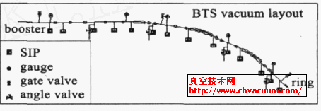 上海光源(Shanghai Synchrotron Radiation Facility ,SSRF) 是我國在建的專用第三代同步輻射光源,由直線加速器、增強器和儲存環組成,位置分布見圖1。SSRF 儲存電子能量3.5 GeV ,流強200 mA~300mA。電子由直線加速器加速預能量至150 MeV ,經過增強器升能到3.5 GeV 后注入到儲存環中。在直線加速器、增強器和儲存環之間分別有低能輸運線(Linac to Booster ,LTB) 和高能輸運線(Booster to Ring ,BTS) 連接,輸運線的主要作用是將束流有效的傳輸到增強器和儲存環中,使得傳輸束流的Twiss 參數與注入點處的橫向截面參數匹配。另外,由于儲存環的真空度優于增強器,所以輸運線的真空系統應該保障在交界位置壓力環境的相容性。