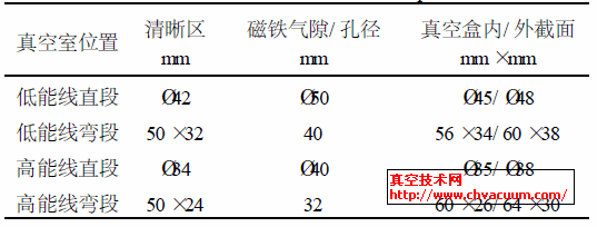 輸運線四極鐵區域的束流清晰區是圓形包絡,二極鐵區域的束流清晰區是橢圓包絡,因此直段區域的真空盒是圓形截面,彎段區域的真空盒是矩形截面。表1 是高、低能輸運線磁鐵孔徑、清晰區以及真空盒尺寸。