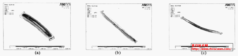 由于真空盒抽真空后,盒體表面上承受的大氣壓力導致其發生向內的凹陷變形,盒體的厚度必須保證變形后的盒體與束流清晰區仍然有足夠的間距。我們用有限元數值計算方法分析了高、低能輸運線彎段真空盒的變形情況,計算采用ANSYS810結構分析軟件包,直接在ANSYS 程序中建立真空盒模型,材料的彈性模量200 GPa ,泊松比0.3。固定長度方向的兩個端面,其余4 個外表面施加1.0 ×105 Pa 的壓力,計算結果見圖4 (a) ,4 (b) ,另外由于高能輸運線彎段真空室長度達到2.2 m ,因此考慮了高能線彎段真空室在自重作用和真空負載雙重作用下的變形,結果見圖4 (c) 。