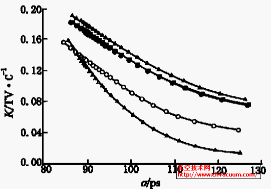 □———鍍膜陶瓷真空室; ○———內徑35 mm 突變不銹鋼管道; △———無鍍膜陶瓷真空室外加導電鋁箔;●———鍍膜陶瓷真空室外加導電鋁箔;▲———鍍膜陶瓷真空室外加鐵氧體磁鐵