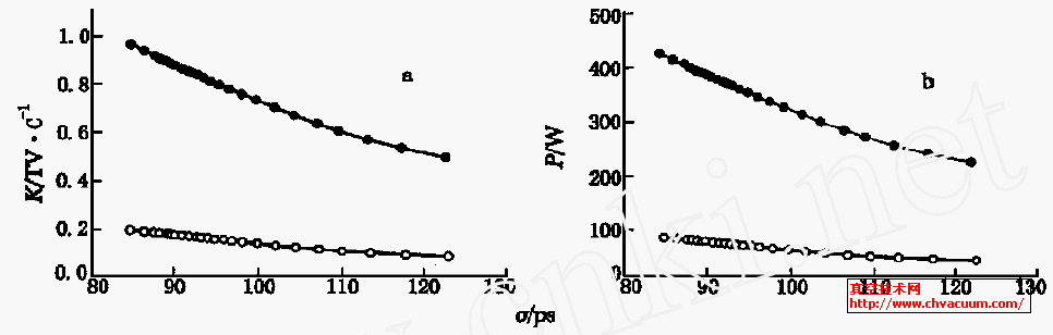 從圖3 可見,對應于σ= 100 ps ,鍍膜真空室、未鍍膜真空室外加導電鋁箔及內徑35 mm突變不銹鋼管道的K 值分別為0.134 、0.091和0.063 TV/ C。因此,進一步增加鍍膜厚度估計能夠使K 值進一步減小, K 值大約能達到目前的1/2 。