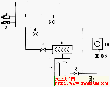 1. 真空室2. 電離真空規3. 熱偶真空規4. 放氣閥5. 高真空閥6. 冷阱7. 擴散泵8. 前級真空閥9. 電磁放氣閥10. 機械真空泵11. 預抽閥
