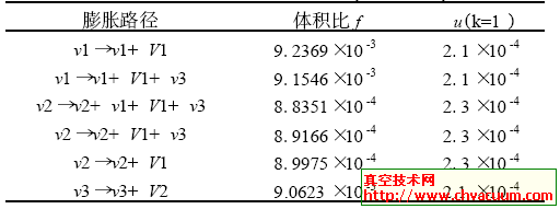 氣體通過不同容積的小體積向大體積膨脹,可以獲得不同體積比:通過v1或v2向大體積V1膨脹,以及v3向V2膨脹,分別得到10-2或10-3的壓降率,不同的膨脹路徑得到的體積比如表1所示。為了得到更大的壓降,我們采用在I 級膨脹室循環(huán)多次的方法,可得到從10-2到10-9一系列不同的體積比。前級壓力取樣范圍(104~105) Pa, 經(jīng)過不同路徑的膨脹,可得到(10-4~103) Pa的不同測量值。為了確定體積比值,我們采用灌水稱重法來獲得小體積的容積值,采用參考體積法來獲得大體積的容積值。