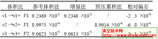 為了驗證體積比測量的準(zhǔn)確性,也為了找出大體積可能的系統(tǒng)差,我們對目前常用的累積法做了改進(jìn)。由于累積法每次測量耗時長,且前10次膨脹不計入,所以我們提出了增量法和預(yù)壓累積法,分別對1∶100和1∶1000的體積比進(jìn)行了復(fù)測,測量結(jié)果如表2 所示。