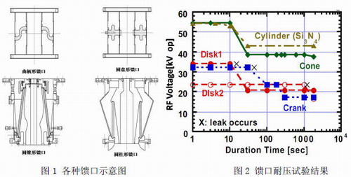 EAST 新型ICRF 天線的設(shè)計(jì)目標(biāo)是為等離子體提供1000s 長(zhǎng)脈沖可連續(xù)波加熱,頻率范圍為30~100MHz,傳輸線阻抗為50Ω,加熱功率為1.5~3MW。在ICRF 天線裝置中,真空饋口位于真空傳輸線和高壓氣體傳輸線之間,起到隔絕真空的作用。真空饋口是ICRF 天線中最為脆弱也是最容易發(fā)生“打火”現(xiàn)象的部件。一旦發(fā)生打火現(xiàn)象,將有可能破壞饋口的密封性能,同時(shí)也有可能因?yàn)閷⒔^緣陶瓷擊穿而發(fā)生短路現(xiàn)象,從而造成ICRF 天線的故障甚至于導(dǎo)致整個(gè)實(shí)驗(yàn)裝置的故障。因此當(dāng)傳輸能量達(dá)到MW 量級(jí)時(shí),真空饋口必須可以承受高達(dá)幾十KV 的電壓。真空饋口作為關(guān)鍵部件,其穩(wěn)定性直接關(guān)系到ICRF 系統(tǒng)甚至是整個(gè)實(shí)驗(yàn)裝置。正因?yàn)槿绱耍澜绺鲊?guó)的裝置也都在不斷地探索不同形式的饋口以滿足實(shí)驗(yàn)要求。雖然各國(guó)的真空饋口結(jié)構(gòu)形式各不相同,但是按照陶瓷的結(jié)構(gòu)形狀劃分,真空饋口的結(jié)構(gòu)可以劃分為四種類(lèi)型:分別是曲柄形狀真空饋口,圓盤(pán)形狀真空饋口,圓錐形狀真空饋口和圓柱體形狀的真空饋口(圖1)。在LHD 裝置中對(duì)這四種饋口的耐壓性能進(jìn)行了測(cè)試,結(jié)果如圖2 所示,其中以圓柱及圓錐形饋口的耐壓性能最好。