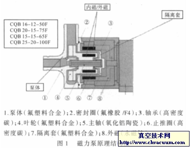 磁力傳動(dòng)泵(簡(jiǎn)稱(chēng)磁力泵)是應(yīng)用現(xiàn)代磁力學(xué)原理(磁力泵原理結(jié)構(gòu)如圖1 所示),利用永磁體的磁力傳動(dòng)實(shí)現(xiàn)扭矩的無(wú)接觸傳遞的一種新型泵。磁力泵由泵、磁力傳動(dòng)器、電動(dòng)機(jī)三部分組成。關(guān)鍵部件磁力傳動(dòng)器由外磁轉(zhuǎn)子、內(nèi)磁轉(zhuǎn)子及不導(dǎo)磁的隔離套組成。內(nèi)磁采用高強(qiáng)度永磁體嵌入氟塑料中,與液體接觸部分為氟塑料,內(nèi)磁與外磁中間用隔離套完全隔離,由外磁聯(lián)軸器間接帶動(dòng)內(nèi)磁轉(zhuǎn)動(dòng)。隔離套采用氟塑料合金制成,將泵腔與外界完全隔離,使泵室完全處于封閉狀態(tài),從而使輸送過(guò)程達(dá)到零泄漏。泵體全部采用氟塑料制成,可輸送任意腐蝕性介質(zhì)。當(dāng)電動(dòng)機(jī)帶動(dòng)外磁轉(zhuǎn)子旋轉(zhuǎn)時(shí),磁場(chǎng)能穿透空氣隙和非磁性物質(zhì),帶動(dòng)與葉輪相連的內(nèi)磁轉(zhuǎn)子作同步旋轉(zhuǎn),實(shí)現(xiàn)動(dòng)力的無(wú)接觸傳遞,將動(dòng)密封轉(zhuǎn)化為靜密封。由于泵軸、內(nèi)磁轉(zhuǎn)子被泵體、隔離套完全封閉,是一種全密封、無(wú)泄漏、無(wú)污染的新型工業(yè)用泵[4]。循環(huán)系統(tǒng)與大功率X 射線源連接,形成一體化大功率X 射線源系統(tǒng),具有尺寸小、噪音低、冷卻效率高的優(yōu)點(diǎn),能很好的滿足目前整機(jī)產(chǎn)品的需要。