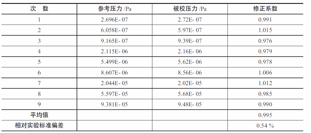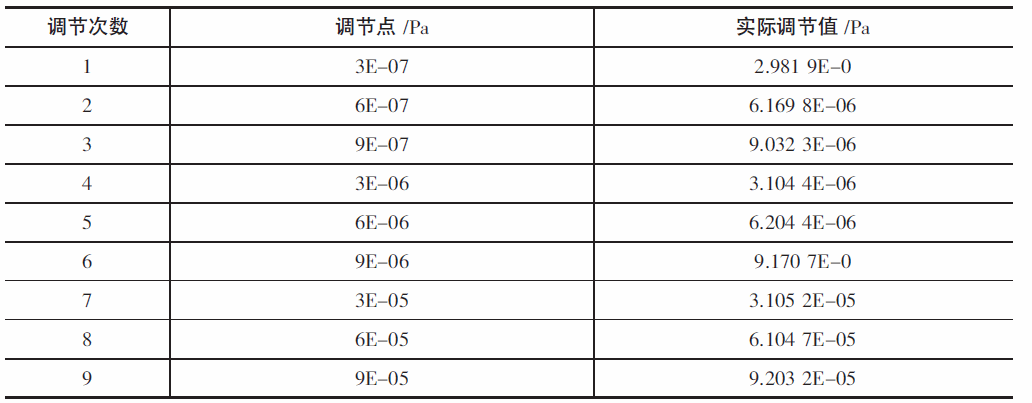 用超高真空微調閥(15)調節穩壓室中的壓力,注入到校準室中,每個量程選擇3個校準點,觀測微調閥是否能夠調出所要求校準范圍的壓力點。壓力點的讀數采用經校準過的IE514 型分離規,數據見表1。