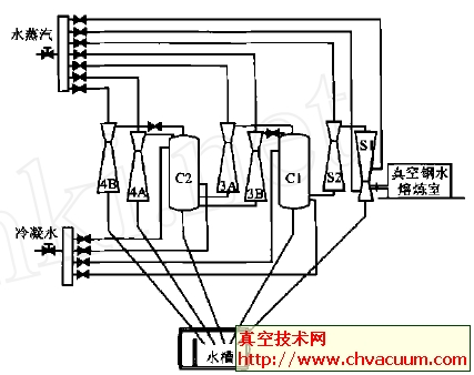 S1 —一級泵,S2 —二級泵,3A —三級泵A;3B —三級泵B ,4A —四級泵A ,4B —四級泵B ,C1 —冷凝器1 ,C2 —冷凝器