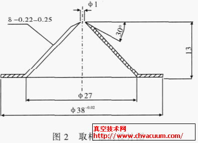 二級真空前端的取樣錐設計是在考慮到本儀器的真空要求和與離子透鏡的匹配基礎上進行尺寸設計(見圖2),其頂部的小孔直徑需要根據真空要求進行調整。
