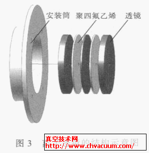 三級真空前端的離子透鏡采用“厚、薄、厚”的結構(見圖3)。厚透鏡片的厚度4 mm,薄透鏡片的厚度為1 mm,透鏡元件之間用1 mm 厚的聚四氟乙烯墊環隔開,起到了絕緣和密封的作用。離子透鏡組件的三片透鏡和兩片聚四氟乙烯絕緣片一同被安裝到透鏡安裝筒內。安裝筒的材料為聚四氟乙烯,起到了絕緣和密封的作用,它的外徑與二三級連接件的內徑相同,因此可以嵌入安裝到二三級連接件內部。離子透鏡組件的另一側用來安裝離子阱。