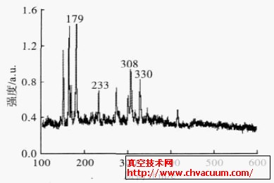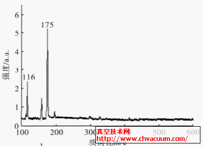 在離子阱前端蓋處可檢測到大于50×10-12A的離子流,證明了整個真空系統具有較好的去溶效果和較高的離子傳輸效率,達到了離子阱質量分析器所要求的工作條件。應用研制的ESI 離子阱質譜儀樣機對一些簡單的有機物進行了初步測試,圖5 為精氨酸的質譜圖,圖6 為谷光甘肽的質譜圖, 質譜峰位和根據分子結構式推斷出的峰位完全一致。通過這些測試可以確認該離子阱質譜儀樣機的質量范圍已經達到質荷比600, 分辨率優于300。這也證明了真空系統設計符合該ESI 質譜儀的設計要求。