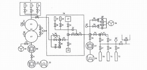 52,59,62,63,65,66,67,68,69.截止閥;9.分離規;10.四極質譜計;11.上球室;12.限流孔;13,15,19,21,56.角;14,45.磁懸浮轉子規;16.冷陰極規;17.下球室;18,54.濺射離子泵;20,22,57.分子泵;23,58.機械泵;27,32,34,39,41,47,51,55,60.定容室各體積;31.差壓電容薄膜規;36,61.針閥;38.流導小孔;44.標準體積;48,53.絕壓電容薄膜規;64.壓力表;70,71,72.氣瓶。
