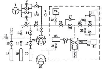 28,29,30,32,33,36, 37,閥門;7. 磁懸浮轉(zhuǎn)子規(guī)(SRG);9. 針閥;12. 壓力表;18,19,20氣瓶;21 角閥;22分子泵;23.機械泵;24 穩(wěn)壓室;31,34小孔;35 油處理器;38.波紋管;39.油室;40.活塞;41. 電機。