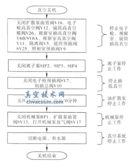 整體控制程序設置了真空開機及真空關機的自動功能,自動開關機流程如圖3 及圖4 所示。真空循環中設置了換樣品時對樣品室單獨進行抽放氣的自動功能,換照相底片時對照相室單獨進行抽放氣的自動功能,某些特殊情況下對鏡筒部分單獨抽放氣的自動功能等。