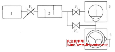 1. 被抽容器2.過濾器3.羅茨泵4.滑閥泵5.水環泵V1~V4.閥門V5.可調閥門