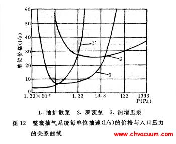 圖12:油擴散泵、油增壓泵、羅茨泵系統單位抽氣速率(L/s)的價格與入口壓強間的關系曲線