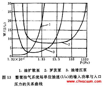 當兩種類型以上的泵都適合選用時,則要根據經濟指標來確定主泵。在比較經濟指標時,要從整套真空系統來考慮。如圖12是油擴散泵、油增壓泵、羅茨泵系統單位抽氣速率(L/s)的價格與入口壓強間的關系曲線。圖13是單位抽氣速率(L/s)的輸入功率與入口壓強的關系曲線。由兩個圖中的曲線可見,在1.33×10-1~13.3Pa的壓強范圍內,以油增壓泵為主泵的真空系統比較經濟,所需要的功率小。在壓強低于1.33×104Pa的范圍內,油擴散泵抽氣系統比較經濟。在壓強高于13.3Pa的范圍內,羅茨泵抽氣系統比較經濟。所以在選泵過程中應立足于即適用又經濟。